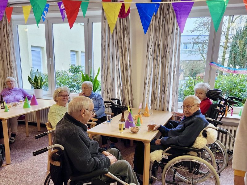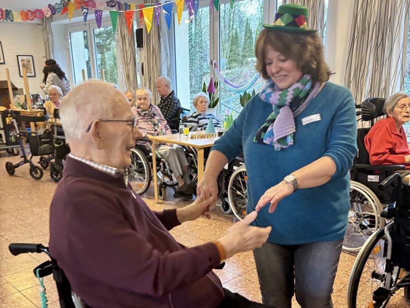 Auch das Tanzbein wurde geschwungen: Ob Walzer, Schunkeln oder einfach ein paar fröhliche Schritte zur Karnevalsmusik – die Freude an der Bewegung stand im Mittelpunkt. Unsere Bewohnerinnen und Bewohner bewiesen einmal mehr, dass Tanzen keine Frage des Alters ist.